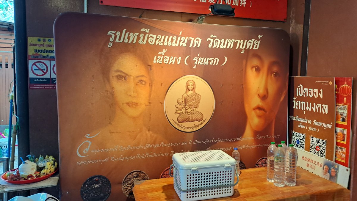 祠にはメー・ナーク像が祀られています。独特の雰囲気のある像で、周りの絵画(写真)にも幽霊らしさを感じ、すこし背筋が寒くなるのを感じます。実際には落ち着いた祠であり、タイ人の参拝者が敬虔に祈りを捧げる場でもあります。