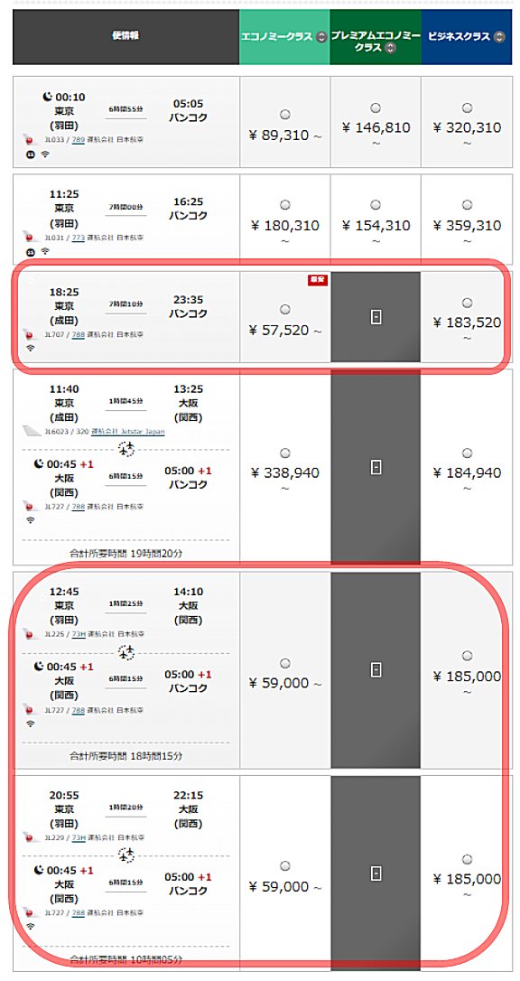 日本(羽田・成田)からバンコクに行く場合、航空会社はJALを使いたいができるだけ価格を抑えたい場合、「関西空港乗り換え(トランジット)」便のほうが価格が安い場合があります(必ず安いわけではありません)。