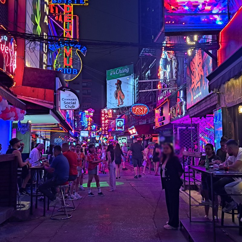夜はネオンが輝き、オープンテーブルに欧米人などが集い、ナイトライフを楽しむ場所になります。